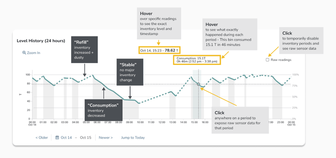 Inventory levels and trends are easier to understand with the improved ProSense HD bin level graphs. They display a clearer indication of how inventory levels are changing over time and identify dusty or uncertain periods. Contact your Customer Success representative for more information.