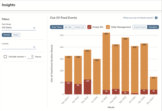- On the Insights page, data labels are displayed directly on the out-of-feed event charts.