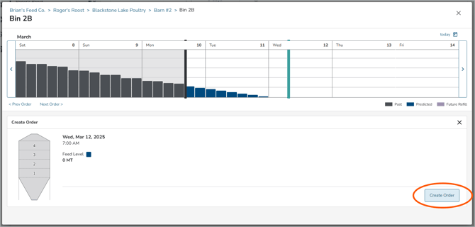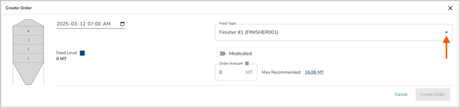 You can then click on the Create Order button and see all of the feed types you have set up in the drop-down list. Select the one you would like, choose the amount to deliver and place your order.