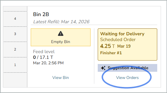 You can change the feed type in a bin every time you Create or Save an Order in BinSentry. To change the feed type in a particular bin, navigate to the bin card. Click on View Orders.