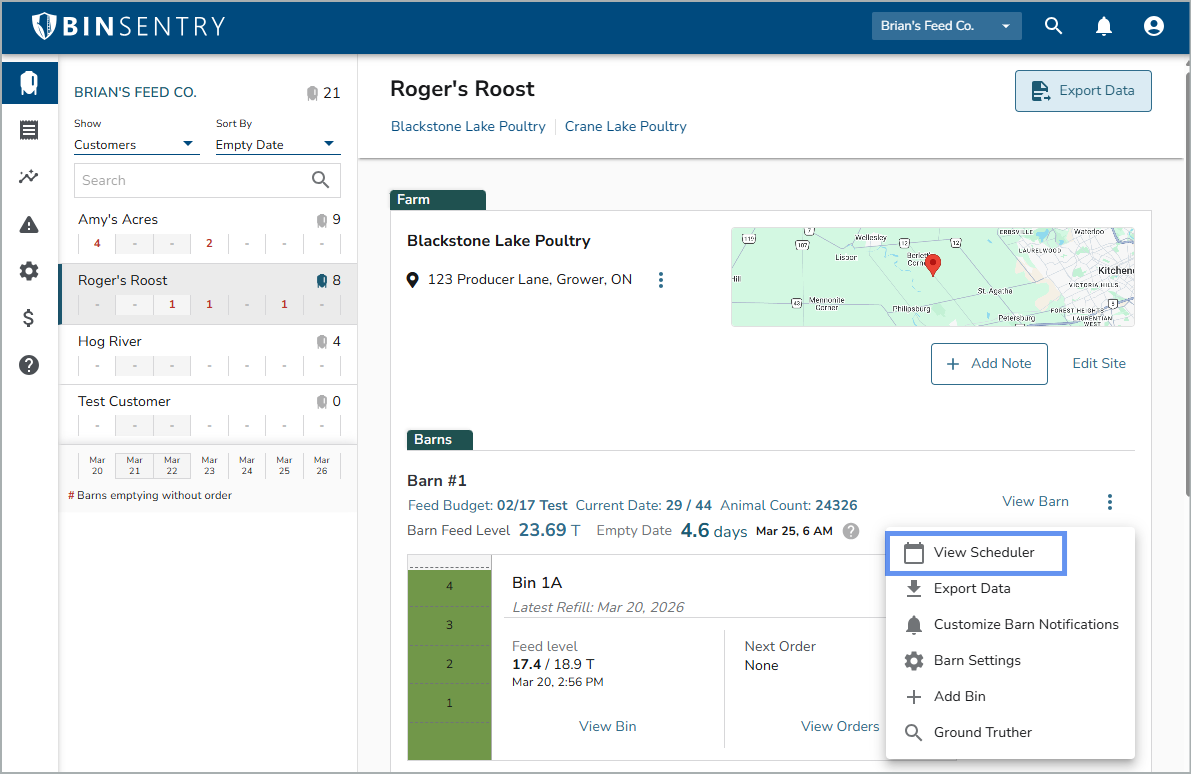 - Click the "Bins" icon on the top left, locate bins and select the 3 dot sub-menu to select "View Scheduler".