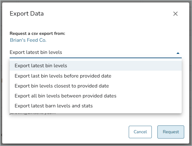 - If you choose any option except for "Export latest bin levels", you will be prompted to add a time or timeframe.