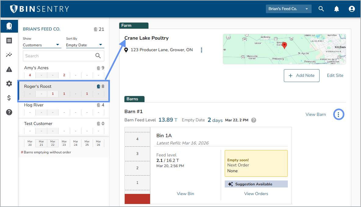 - Select the Customer or Farm that you'd like to export data from, the click the 3 dots next to "View Barn" then selected the option: Export All Bin Levels.