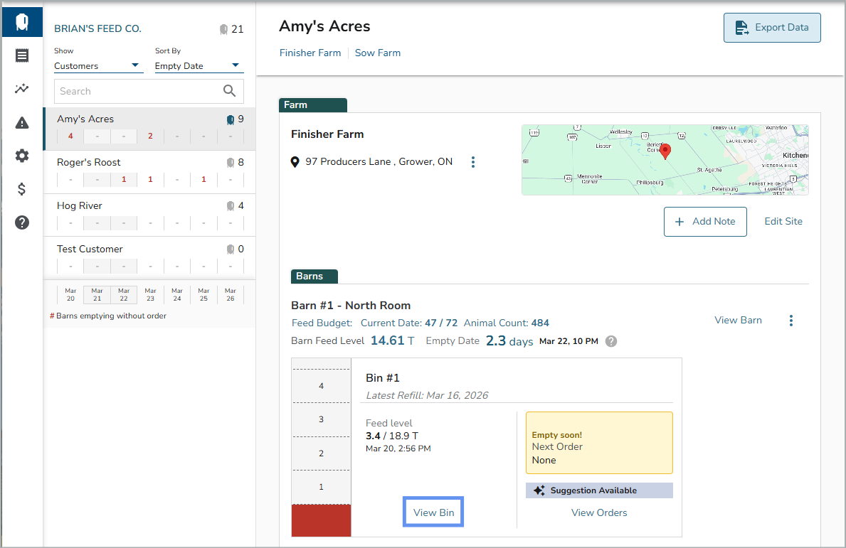 - Select the Customer or Farm from the drop-down menu then find the bin that you would like to know refill details about and click on "View Bin".